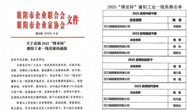 近日,从襄阳市企业联合会传来喜讯,在2025“博亚杯”襄阳工业一线英雄评选活动中,凯发k8国际首页城建9名干部职工凭借突出表现,